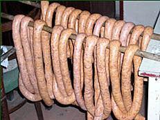 A ledarált, kolbásznak való húst (ehhez a sódarokról, oldalasról, egyéb helyekről származó nyesedéket használta fel), a házigazda borssal, fokhagymával, pirospaprikával, sóval, ízesítette, majd disznóbélbe töltötték. Most kevesebbet készített, mint 10 kg, de ha többet akar, akkor egy első sódart is beledarál. Ezután a készítmény a padláson szikkad egy napig, majd füstre kerül.