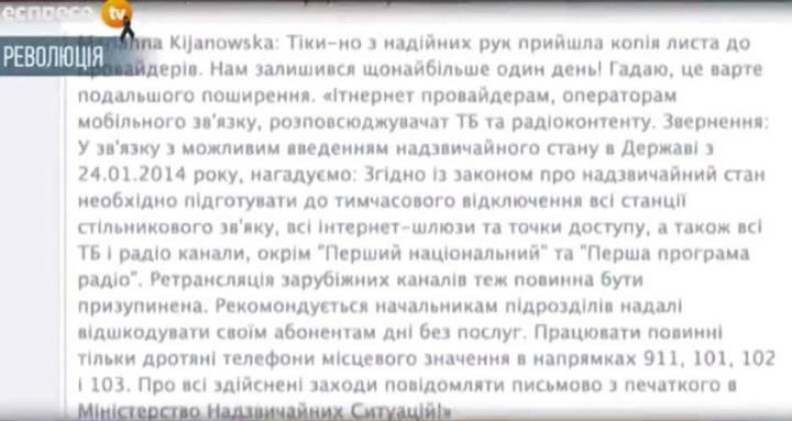Bár Janukovics elnök és környezete egyelőre tagadja, az egyre szaporodó jelek szerint egyre valószínűbb a rendkívüli állapot elrendelése Ukrajnában. A kormányellenes tüntetők és a rohamrendőrök összecsapásait egyenes adásban közvetítő internetes espreso.tv nyilvánosságra hozott egy hitelesnek tűnő felszólító levelet, amelyet az elmúlt órákban kézbesítettek az ukrajnai internet- és mobilszolgáltatóknak, valamint földfelszíni televízió- és rádióműsor-szórással foglalkozó telekommunikációs vállalatok vezetőinek az ukrán rendkívüli helyzetek minisztériumának aláírásával.