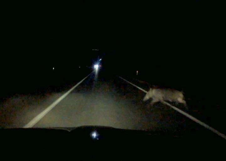 A felvételen jól látszik, hogy a vadállat váratlanul szaladt ki az út menti erdőből, és szinte a jármű előtt jelent meg a sötét útszakaszon. Majd ütés érte az autót, nyilván abban a pillanatban, amikor elütötte a vaddisznót, végül a sofőr megállította a járművet.