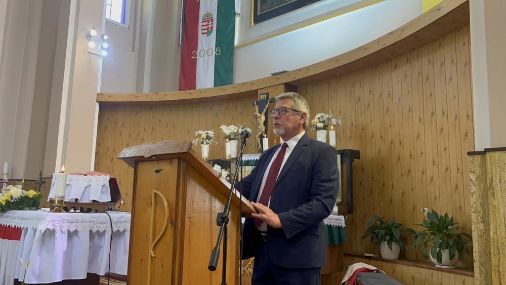 Gulácsy Géza, a KMKSZ alelnöke ünnepi beszédében államalapító Szent István királyunk művét, annak máig ható jelentőségét mutatta be, hangsúlyozva: „Szent István élete és öröksége azt üzeni számunkra, hogy soha nem szabad feladnunk. Ha mindannyian megállunk a saját helyünkön és elvégezzük azt a feladatot, amit az Úristen ránk bízott, akkor van esélye a magyar nemzetnek.” A KMKSZ alelnöke hangsúlyozta, hogy a felső-Tisza-vidéki magyarok számára különös jelentőséggel bírnak nemzeti ünnepeink, ahol meg tudjuk élni magyarságunkat. Ma újra tudatosulhatott a közösségben, hogy sok szállal kapcsolódunk a magyar államhoz is.