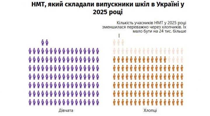 Az Ukrán Oktatásminőség-értékelési Központ által szeptemberben közzétett idei adatokból viszont kitűnik, hogy a háború alatt a ZNO-t felváltó Nemzeti Multidiszciplináris Teszten (NMT) 2025-ben Ukrajnában 121 346 lány és csak 98 994 fiú/férfi (45%) vett részt. Ez azt jelenti, hogy az állam mintegy 24 ezer fiút/férfit „veszített”.