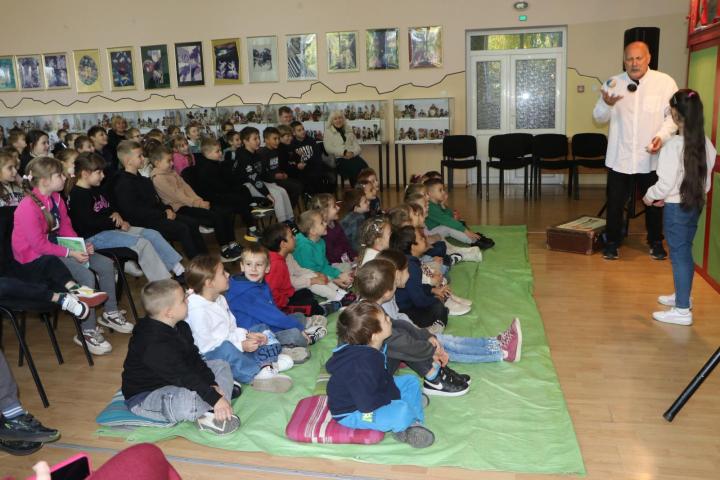 A Blattner-díjas Pályi János felidézte a kisiskolásokkal, mi kell a bábszínházhoz, s a helyes válaszért (bábok, nézők, bábjátékos és történet, mese) titokfüzetet ajándékozott.